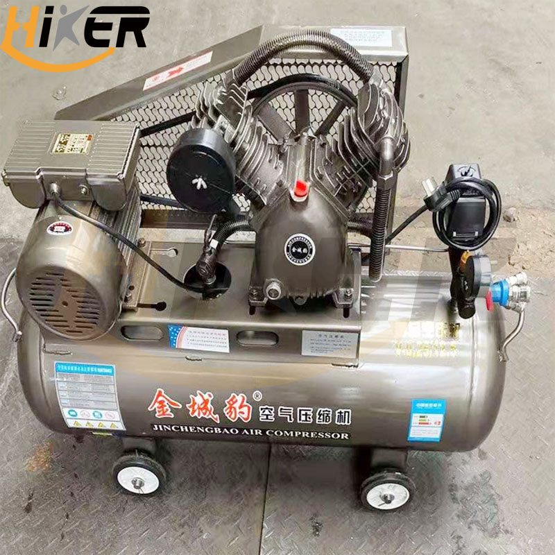 The motor directly drives the compressor, which makes the crankshaft rotate, drives the connecting rod and makes the piston reciprocate, which causes the volume change of the cylinder. Because of the change of the pressure in the cylinder, air enters the cylinder through the air filter (muffler) through the intake valve. During the compression stroke, due to the reduction of the volume of the cylinder, the compressed air passes through the function of the exhaust valve. Through the exhaust pipe, the one-way valve (check valve) enters the storage tank. When the exhaust pressure reaches the rated pressure of 0.7MPa, it is controlled by the pressure switch and shuts down automatically. When the pressure of gas storage tank is reduced to 0.5-0.6 MPa, the pressure switch is automatically connected and started.